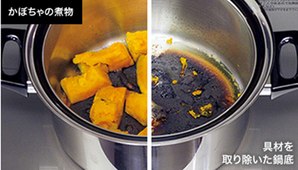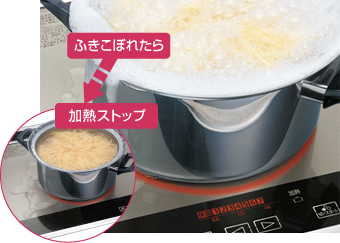 ふきこぼれや焦げ付きのときは加熱が自動的にストップし、音声と文字で教えてくれます。