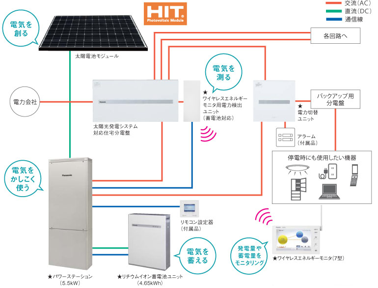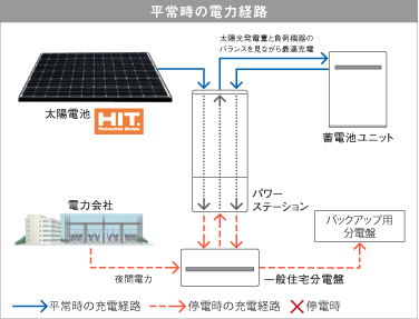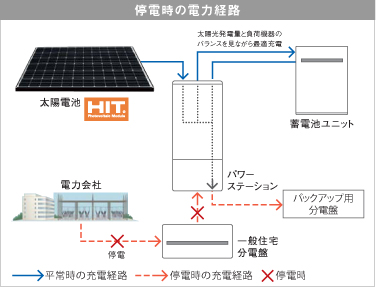 (解説) ●停電時でも、太陽電池で発電した電力はパワーステーションで直流 (DC)変換できるので直接蓄電池に電力を蓄えることができます。 |