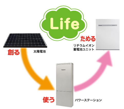 太陽電池とリチウムイオン蓄電池が連携し、停電時も平常時も電力をフル活用できます。 ふだん電気を蓄えておき、停電時には太陽光発電の電力を利用して蓄電池へ貯める。蓄えた電気を夜間の照明や携帯電話の充電などに使えます。