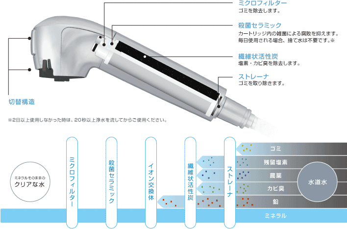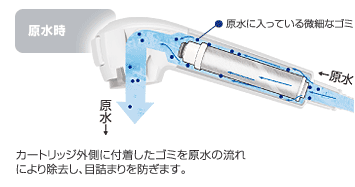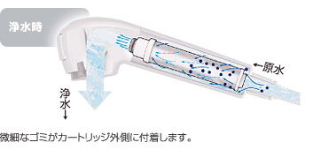 使わないときは殺菌セラミックが水の雑菌の増殖を防ぎます。 原水を使うとき水道水に含まれる微細なゴミを自動的にクリーニングします。この構造で水栓が目詰まりせずカートリッジ交換時期まで快適に水が使えます。