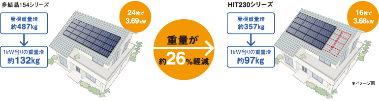 panasonic HIT230シリーズで一般的な約3.7kWのシステムを導入する場合、多結晶154シリーズと比較して約130kg軽くなりました。